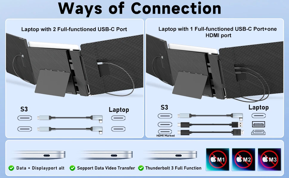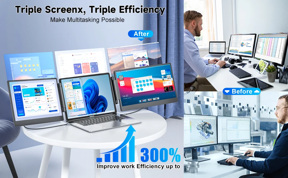 This high-performance portable LCD display system from Kefeya/OEM offers a flexible triple-screen setup designed for business, gaming, and study use. Compatible with 13"–17.3" laptops (maximum stretch 405 mm) and supporting Intel, AMD, ARM, Android, Windows, Mac, ChromeOS, and Linux, it delivers full 1080p clarity on a 16:9 IPS panel with 180° screen rotation, 60 Hz refresh, 14 ms response, and a brightness of 300 cd/m2 with a 1000:1 contrast ratio. The compact 1.5" x 13.89" x 8.14" form factor hides its 4.73 lb weight per unit while providing triple 14" displays, powered via multiple USB-C and HDMI connections (2 x USB-A to USB-C, 2 x USB-C to USB-C, 2 x HDMI-C to USB-C). Built in private mold for a consistent, enterprise-grade finish in black, it supports a wide range of devices through Type-C interface and includes after-sales support via call center and online technical assistance, returns, and replacements. Originating in the United States, this portable multi-screen solution is ideal for boosting productivity, multitasking, and immersive work or entertainment experiences.